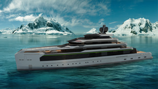 This design takes its inspiration from the Sky Garden, with sustainability and environmental protection at its core. In the general arrangement, the lower decks are dedicated to crew members and tender operations, with a dive store and storage for three large tenders. The entrance for guests and the owner can be found on the main deck, which houses a helicopter hangar, as well as laboratories and a workshop at the stern. The internal space of the main deck features four-metre high ceilings, which is a rarity in yachting given the space restrictions. As an expedition yacht, its robust exterior conveys a feeling of strength and a sense of masculinity with muscular lines along the hull. A "green" ethos is integral to the design, with a photovoltaic roof over the bow providing electricity for long voyages, resulting in a powerful but eco-friendly design.