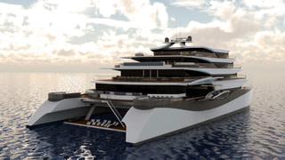 M/Y Mosso is a 60-metre SWATH developed for a world-renowned composer who needed an incredibly stable platform on which to accommodate and entertain his large family, while exemplifying a “classically elegant” aesthetic. The nature of balancing the hull meant that close attention to the centre of gravity had to be paid, without sacrificing the beauty and elegance seen in traditional yachts with lower, sleeker sheer lines and superstructures. Mosso was borne out of a series of gently cascading curves, each overlapping the next, and by grounding the tall vessel with a forward stance. It emanates movement and fluidity. Floor-to-ceiling windows are partly sheathed, providing an ample view as well as privacy, and each deck is equipped with retractable sunshades to allow for use of the outdoor spaces in any condition. The floor plan is composed of a series of golden rectangles which pay homage to classical architectural structures and sacred geometric proportions. The golden ratio benefits the aesthetic of the vessel, and creates a harmonious environment that provides both balance and equilibrium. The direction of all of the berths (only facing fore and aft) also helps to reduce the likelihood of sea sickness. The interior includes such details as sine wave parametric surfacing, creating a composite surface from multiple different waves. Using this technique could potentially allow for accent surfaces directly representative of musical scales or songs. In addition, soundproofing between each floor, along with a performance space on the first deck and top-quality speakers throughout the yacht, ensure that any audiophile is pleased. There are several dedicated entertainment spaces provided on board, including a game room and movie theatre on the family deck that will be sure to amuse both children and adults alike. Outdoors, there is also an infinity edge pool with spectacular views and an open-air spa in the bow. In addition, an aft lowering platform provides a large beach area at water level for enjoying various activities and a seamless departure when using the toys and tenders.