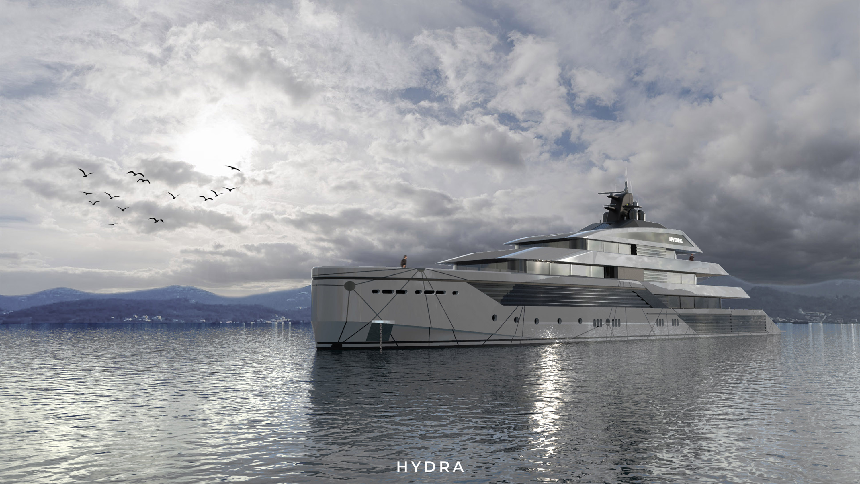 Hydra is an 80-metre refit project named after the mythical sea serpent of Greek mythology and the star constellation of the same name. The exterior design uses cues from current trends in land and naval architecture to create a dynamic and unique aesthetic which would stand out in the yachting industry. The colour palette and geometric lines of the exterior bring the refit to the modern day, whilst the interior benefits from many modern technologies including smart glass that allows light into areas when desired or becomes opaque to create privacy. The yacht also creates electric power to service the yacht and to drive the azimuth pod hybrid propulsion system. The aft beach club space is a unique area which is centrally divided by a glass-walled pool accessed from the aft main deck above. The glass pool brings light into an otherwise dark area, which is appointed with a wellness space that includes a gym, massage room and sauna starboard, and a lounge bar and small cinema room port side. Two large drop-down doors expand the space further to create adjoining bathing platforms and create a seamless indoor/outdoor space.